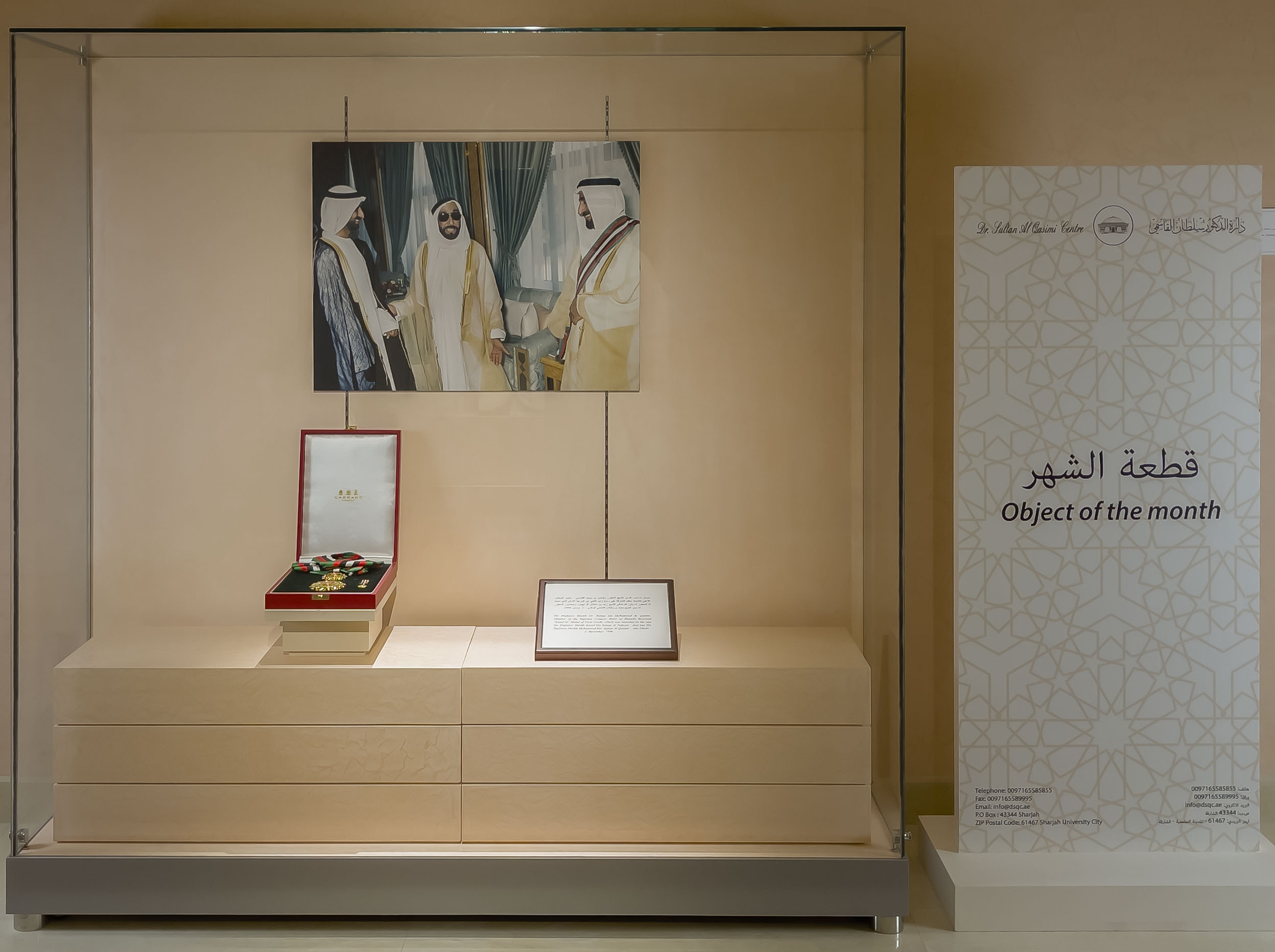 اختارت الدارة ضمن مشروعها قطعة الشهر” وسام زايد الثاني من الدرجة الأولى ” لتكون قطعة شهر نوفمبر 2021 ، حيث حصل صاحب السمو الشيخ الدكتور سلطان بن محمد القاسمي ، عضو المجلس الأعلى للاتحاد ، حاكم الشارقة على وسام زايد الثاني من الدرجة الأولى ، الذي منحه له المغفور له بإذن الله تعالى صاحب السموالشيخ زايد بن سلطان آل نهيان، وبحضور المغفور له سمو الشيخ محمد بن سلطان القاسمي.