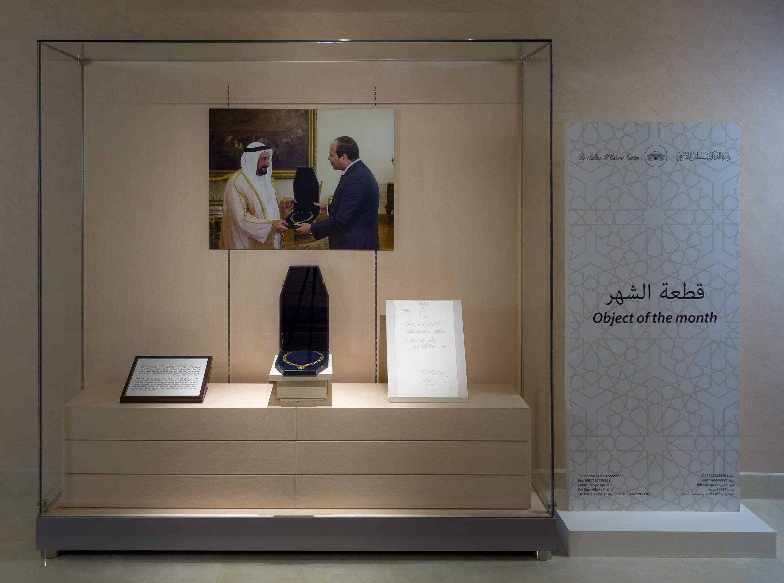 اختارت الدارة ضمن مشروعها ” قطعة الشهر” جائزة قلادة الجمهورية رفيعة القدر لتكون قطعة شهر سبتمبر 2021، حيث تقلد صاحب السمو الشيخ الدكتور سلطان بن محمد القاسمي عضو المجلس الأعلى حاكم الشارقة من فخامة الرئيس المصري عبد الفتاح السيسي قلادة الجمهورية تقديرا وتثمينا لما قدمه وقام به من أجل جمهورية مصر العربية، وعبر السيسي عن بالغ اعتزازه بدور سموه وحرصه المتفاني في خدمة الثقافة والمثقفين في مختلف المجالات الفنية والأدبية والتراثية والشعبية والتاريخية. جمهورية مصر العربية -القاهرة. (11-مايو-2015.)